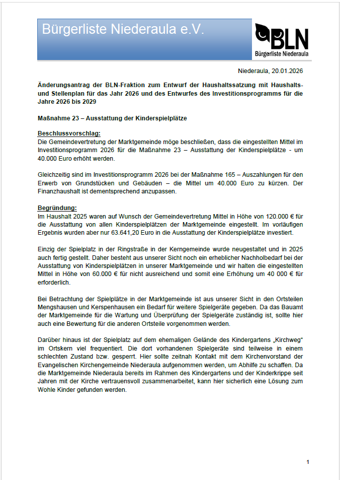 BLN Änderungsantrag zur Ausstattung der Kinderspielplätze T1 Veröffentlicht 20. Februar 2026 am 676 × 953 in Gemeindevertretersitzung vom 17.02.2026